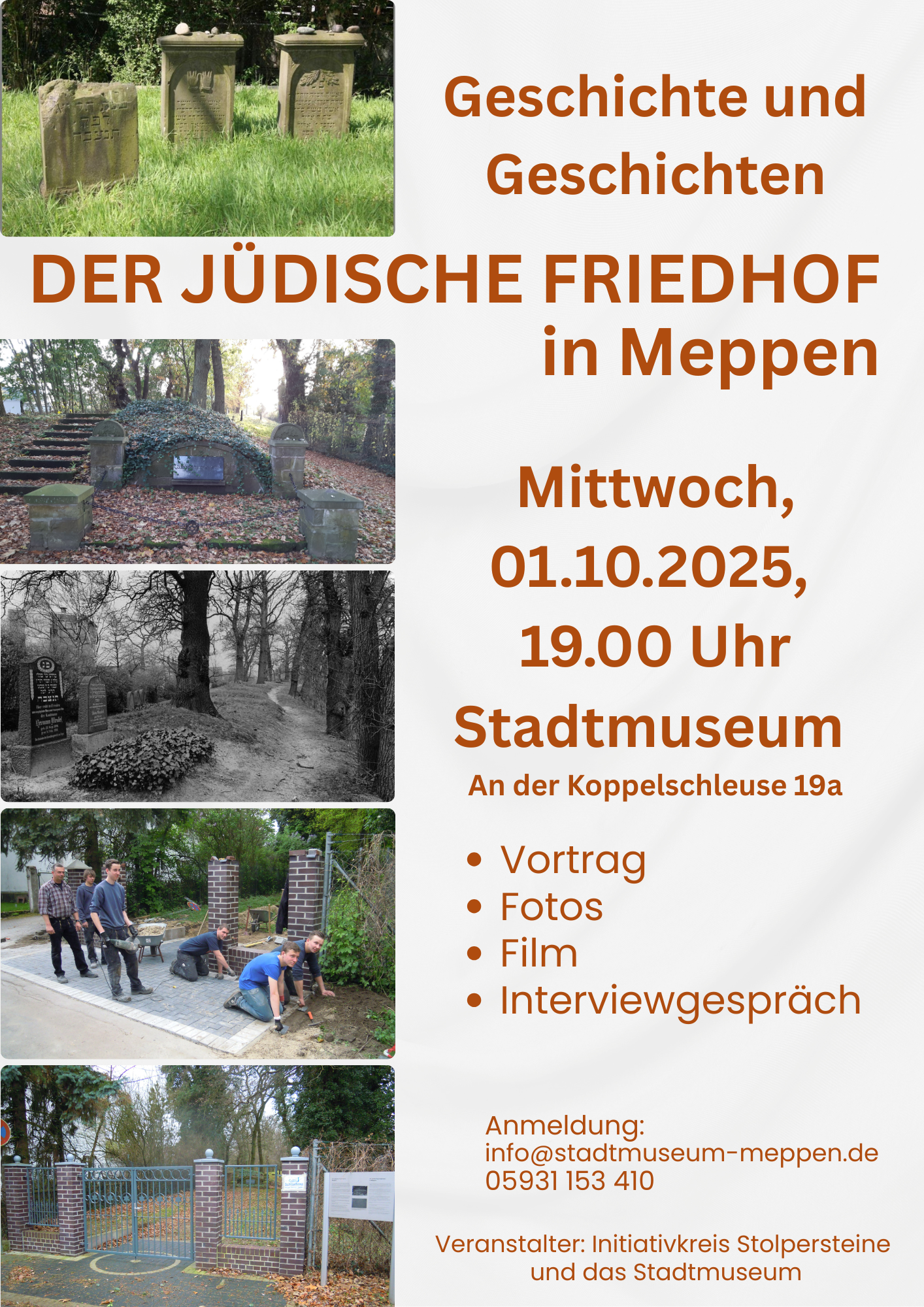Der jüdische Friedhof ist das älteste Zeugnis jüdischen Lebens in Meppen. Als sich um 1700 die ersten Juden in der Stadt niederließen, erwarben sie eine langgestreckte Sanddüne am nördlichen Haseufer, um ihre Toten nach religiösen Riten begraben zu können. Dieser Ort mit seiner langen Geschichte wird von den Mitgliedern des Initiativkreises Stolpersteine am Mittwoch, den [...]