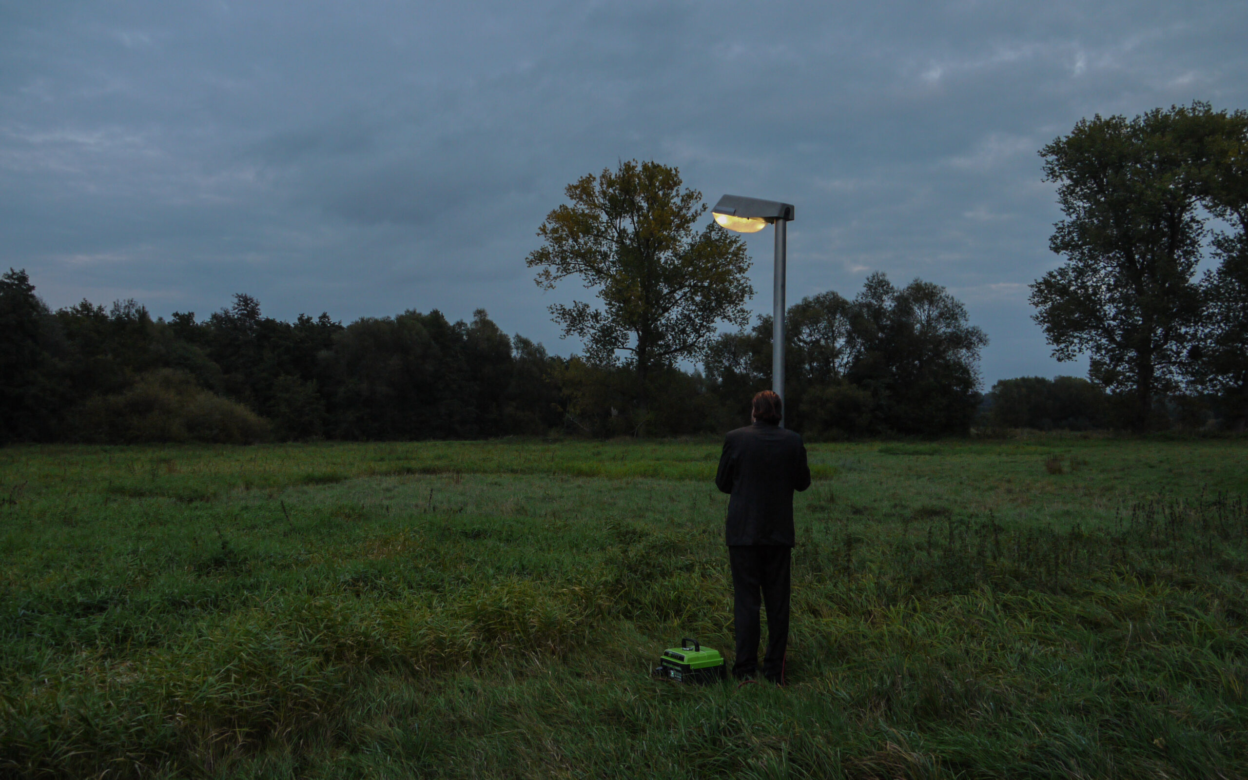 Im Rahmen des Ausstellungsprojekts „ParkLicht. Lichtkunst an der Koppelschleuse“, das von Dirk Raulf kuratiert wurde, werden vom 29. September bis zum 29. Oktober sechs Lichtinstallationen von Künstlern aus ganz Deutschland an der Koppelschleuse gezeigt: Ein Mann im grauen Anzug trägt auf der Schulter eine Straßenlaterne, in der Hand trägt er einen Koffer samt Solarbatterie. [...]